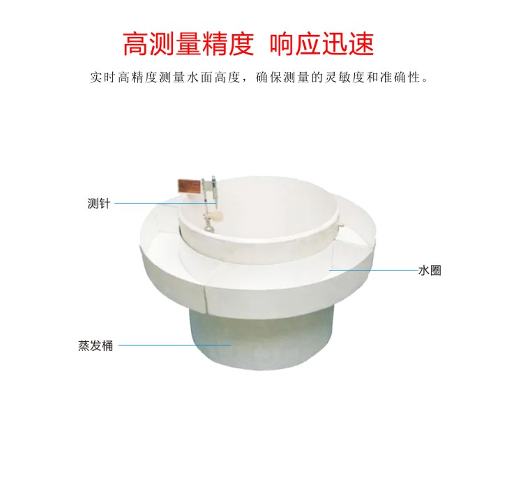 FY-E601B型水面蒸發由音響器、插座測針、蒸發桶、圍圈、橡皮管、溢流桶組成。用測針測得蒸發桶內的準確液位,某一規定時段內的液位差,即為該時段內的水面蒸發量。整個測針部件安裝在蒸發桶內插座孔上。旋轉刻度盤,則測針上下移動,使測針接觸水面。用游標讀數測得液位高度。針尖接觸水面前無音響信號,當針尖一觸水面,音響器電路產生振蕩,發出音響向工作者報以針尖觸水信號。