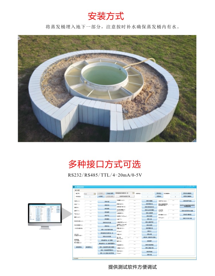 FY-E601B型水面蒸發器是蒸發站網上觀測水面蒸發量的儀器,水文、氣象部門均可使用。該產品具有防腐蝕、防凍裂、隔熱性好、防止小水體和地面劇烈的熱交換、測量精度高、使用方便、壽命長等優點,被國家技術監督局確定為全國水面蒸發觀測的唯一標準儀器并列入國標“GB11829-89”,被水利部、電力部、中國氣象局、中科院列為換代產品,在全國推廣使用。