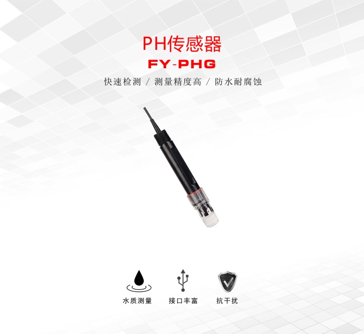 FY-PHG系列PH傳感器采用高靈敏度電解質,能耐壓,并且采用抗污的聚四氟乙烯環形液接界,不易阻塞,可長期在線檢測。電極使用時可根據不同的場合,采用不同的電極敏感膜,在不同條件下進行PH的測量。