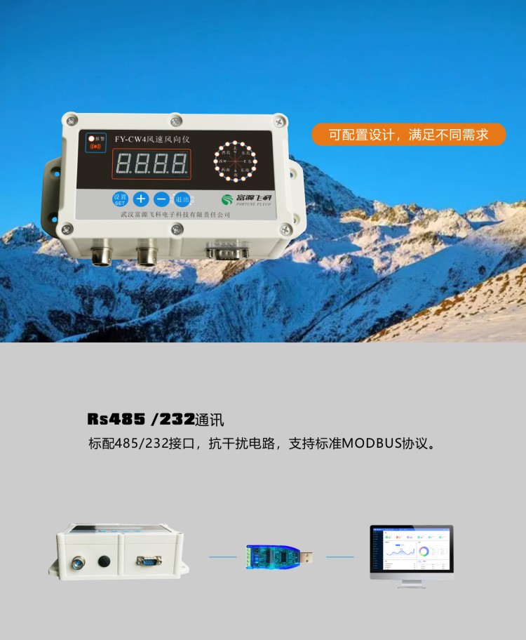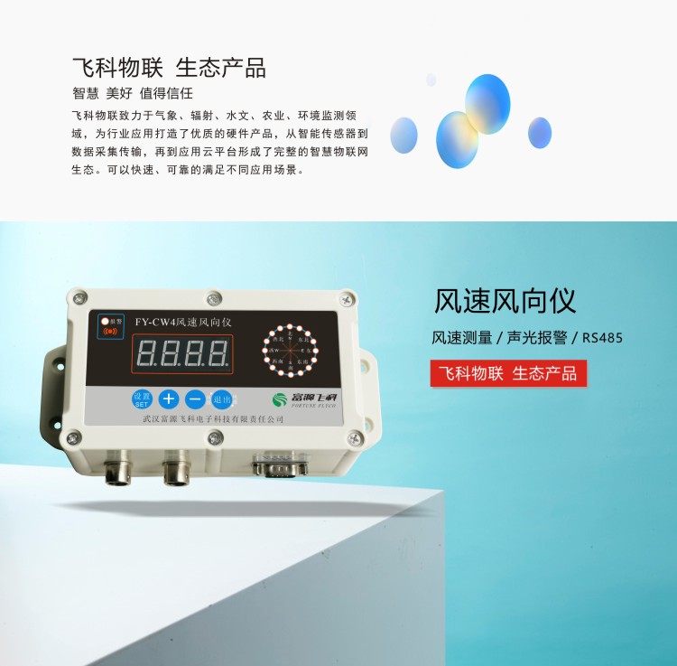 FY-CW4風速風向儀由風速傳感器、風向傳感器及智能數據采集儀構成,是用于測量并記錄大氣中風速與風向的氣象儀器。內置大容量FLASH存儲芯片可自動存儲至少一年的氣象數據;風速傳感器采用傳統三風杯結構,風杯選用碳纖維材料,強度高,啟動好;風向傳感器采用低慣性風標及精密電位器,靈敏度高,精度高;儀器配備有RS232或RS485接口用于與計算機建立有線通訊連接,還可選配GPRS無線模塊建立遠程無線連接,通過配套的上位機軟件可遠程觀測實時風速風向,用戶還可利用該功能完善的氣象軟件對氣象數據作進一步的處理分析。