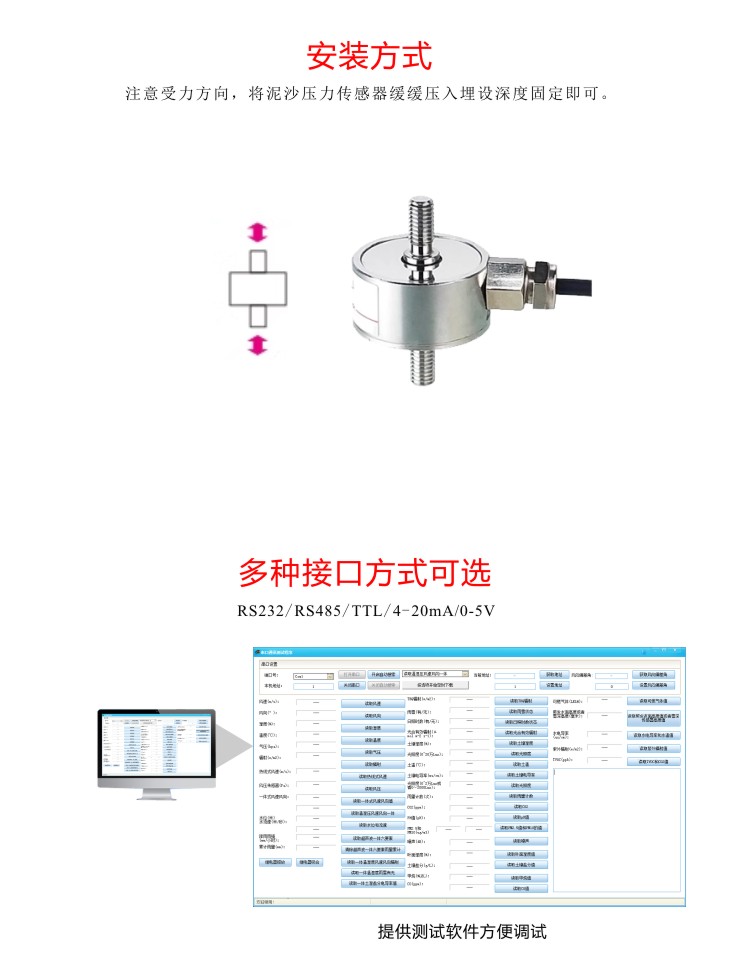 FY-ZLP泥沙壓力傳感器采用不銹鋼結構,微加工硅膜片為核心元件,利用國際先進的微型化制作與封裝工藝,進行了精致巧妙的封裝,產品體積小,結構緊湊,重量輕,堅固耐用,且具有優 良的動靜態特性,該系列產品特別適合土木模擬,離心機模擬等使 用,廣泛應用于巖土力學、土體力學、土木工程以及爆破試驗中。