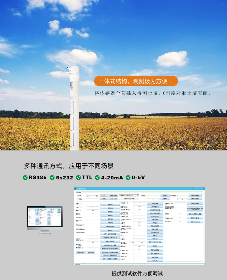 FY-GTH管式土壤墑情監測儀可直接對土壤溫度、土壤水分在線測量。基于公司獨有的專利技術,根據探測器發出的電磁波在不同介電系數物質中的頻率變化,計算出被測土壤含水量。可同時測量不同深度的相關土壤參數,并通過RS485等接口方式上傳至數據中心。該系列產品可以廣泛的應用于抗旱監測、土壤研究、智能灌溉、農產預測和山體滑坡等行業。