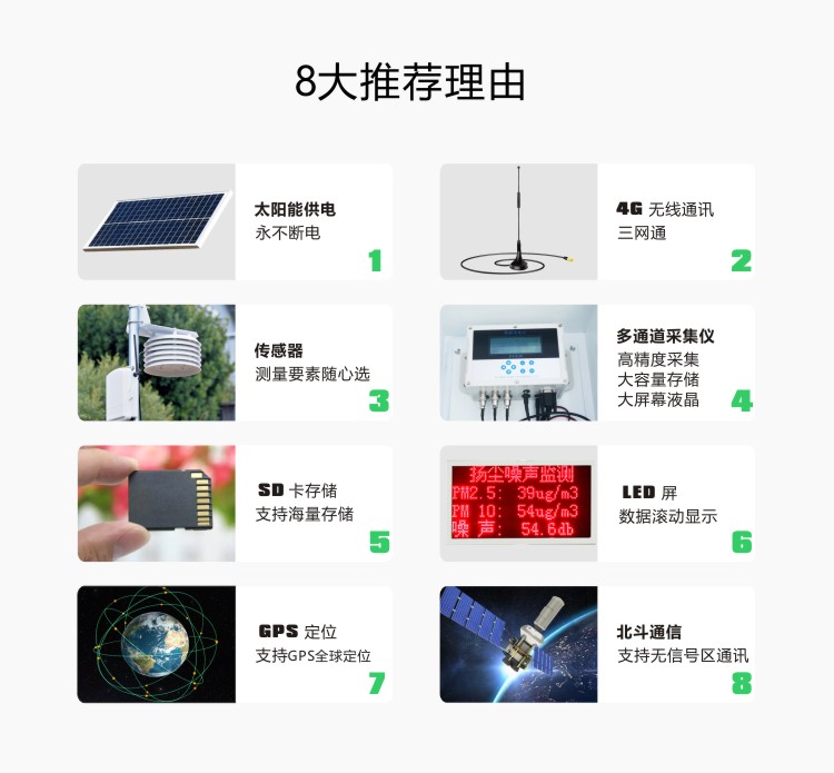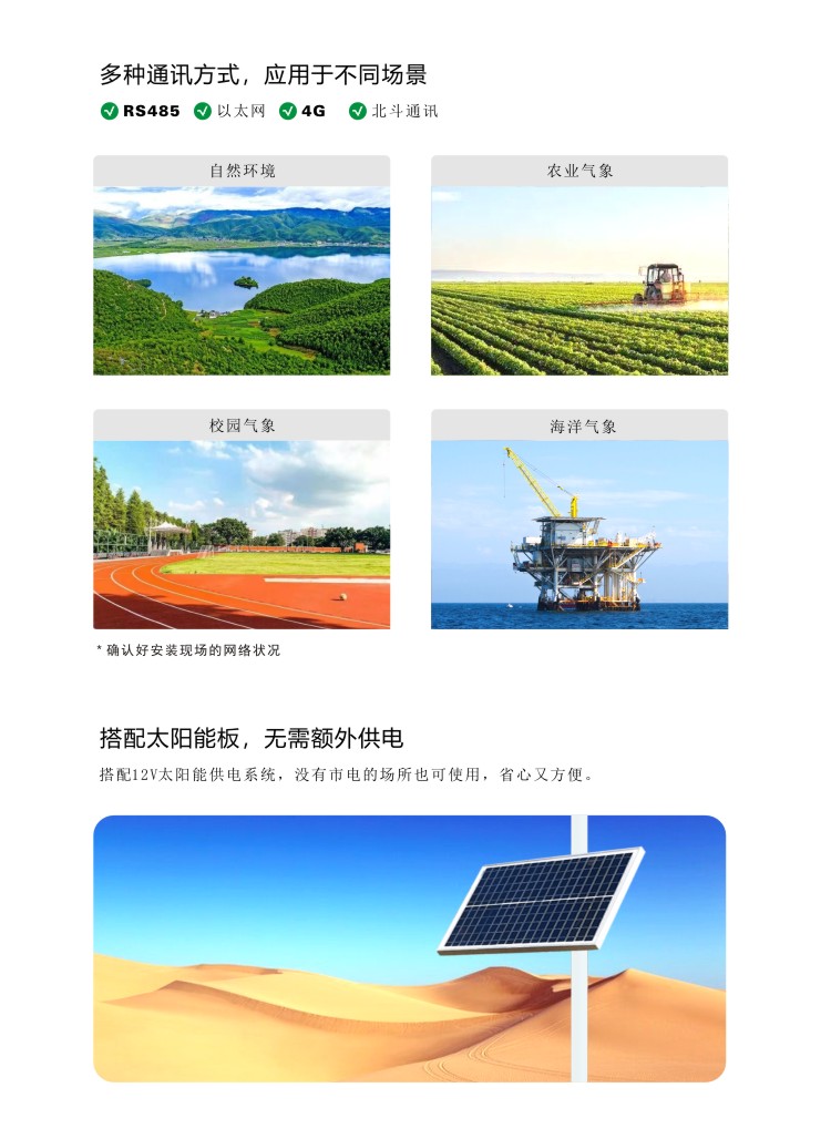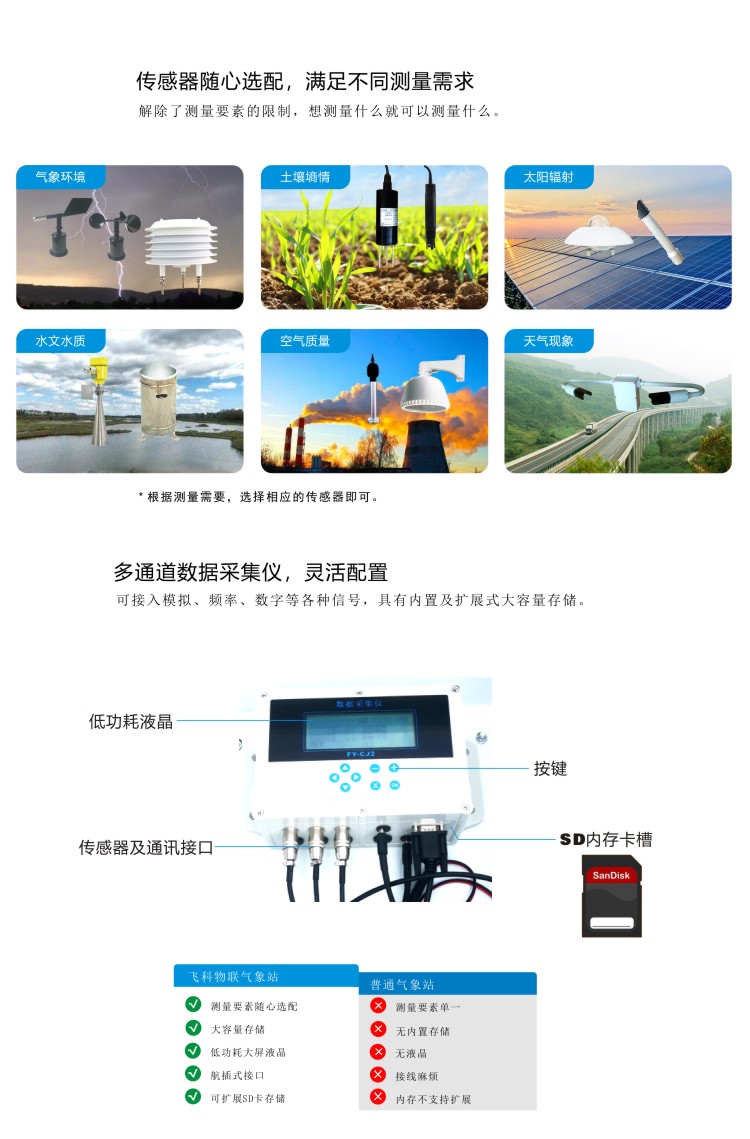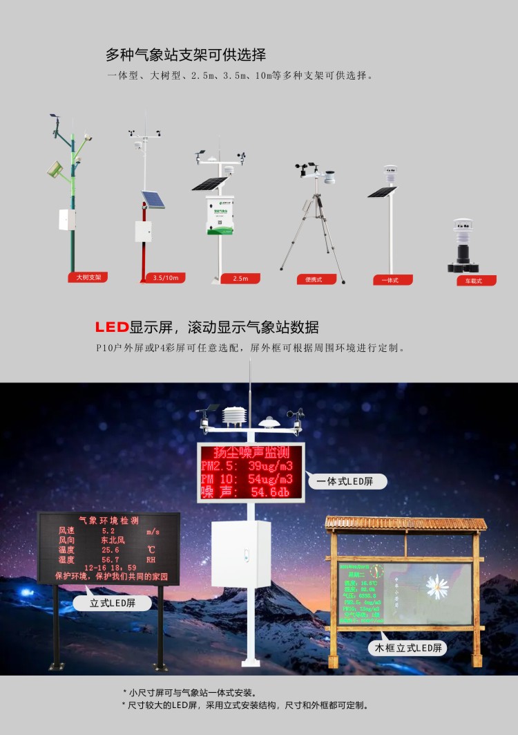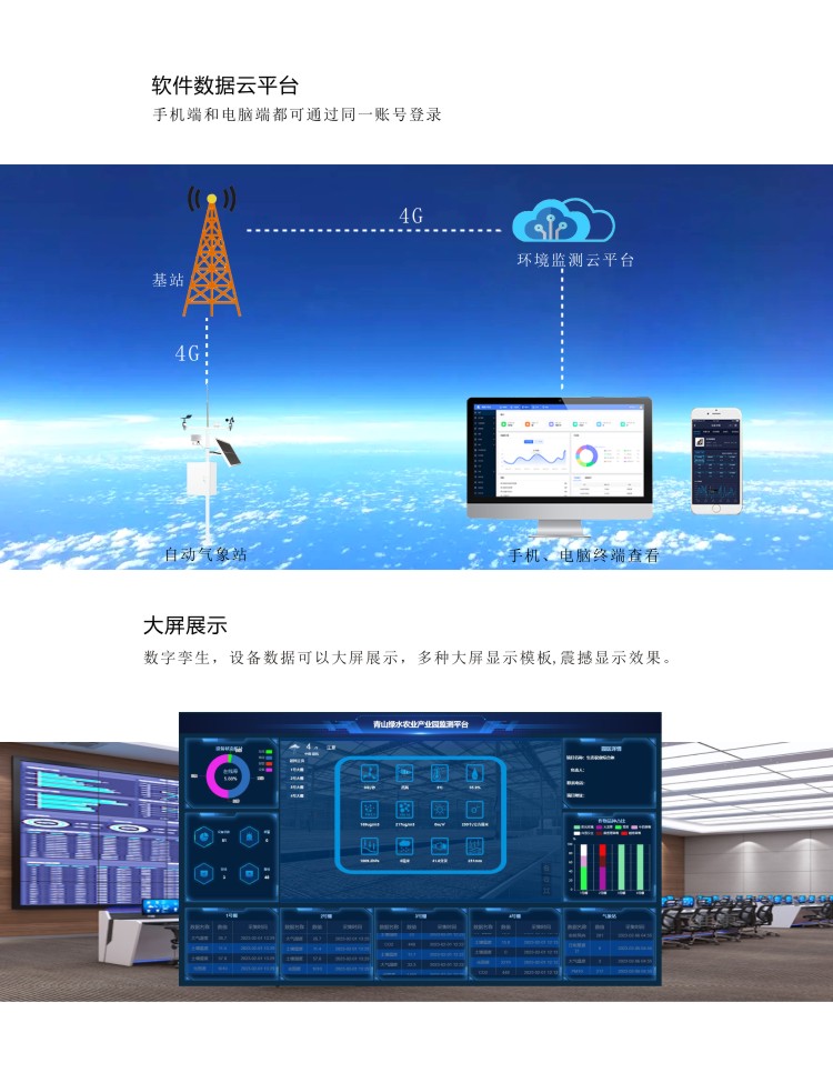 可同時測量并顯示氣溫、相對濕度、土壤溫度、土壤濕度、雨量、蒸發、風速、風向、PM2.5、氣壓、太陽總輻射、光照度、二氧化碳等。