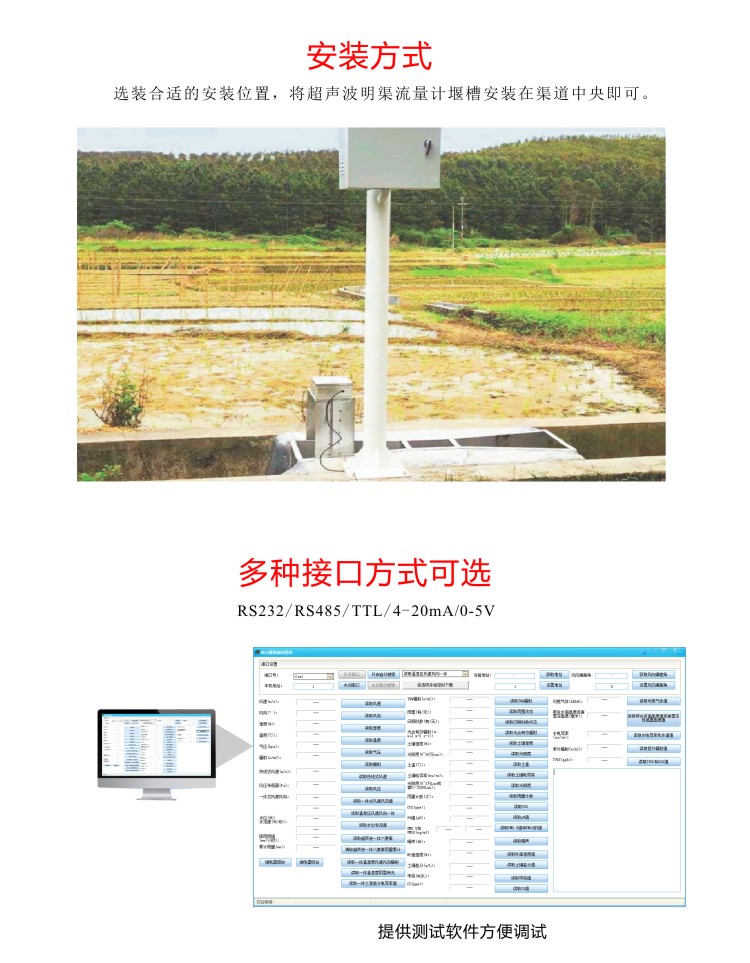 FY-YMLS超聲波明渠流量計,利用超聲波探頭非接觸測量方式測出渠道水位值,再通過水位-流量換算法計算出流量。可根據渠道現場情況搭配相應堰槽(巴歇爾槽、矩形堰、三角堰等)或不搭配堰槽單獨測量。主要應用在農田灌溉渠道、企業排污口、污水處理廠、水電站生態下泄流量監測等現場。