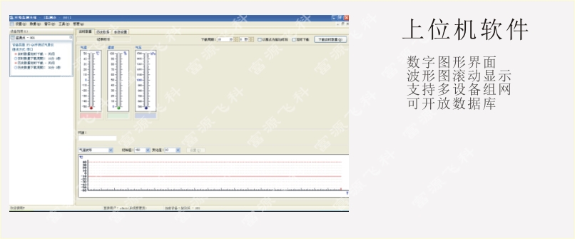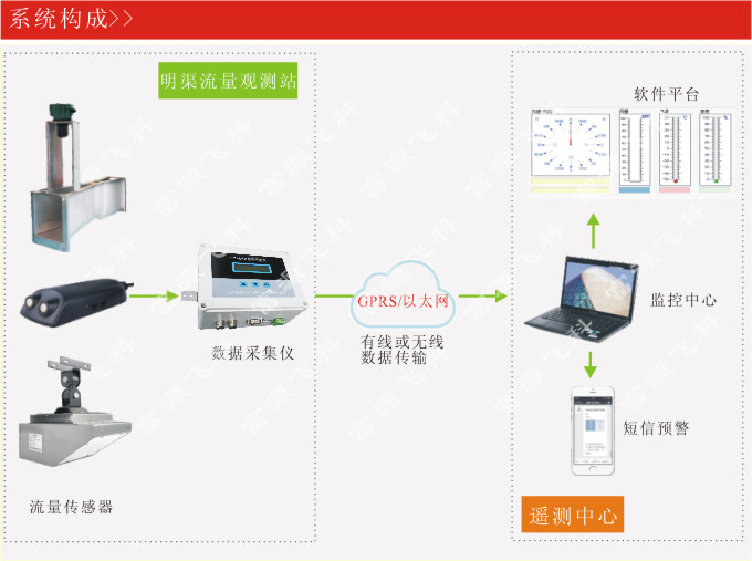 明渠流量觀測站由數據采集儀,傳感器(超聲波流量計、堰槽流量計、多普勒流量計可配置)、上位機軟件、通訊單元及供電系統等部分構成。數據采集儀用于采集及記錄水流量信息,內置大容量FLASH存儲芯片可自動存儲至少一年的氣象數據,儀器配備有多種通訊接口用于與計算機建立有線(RS232、RS485、USB、RJ45)或無線(GPRS)通訊連接;功能強大的上位機軟件可遠程觀測實時流量信息,具有數據庫、報表、打印等功能,用戶還可利用該功能完善的氣象軟件對記錄的數據作進一步的處理分析。