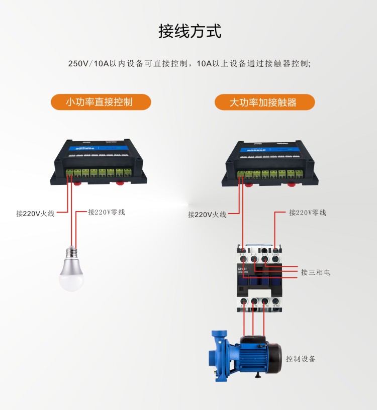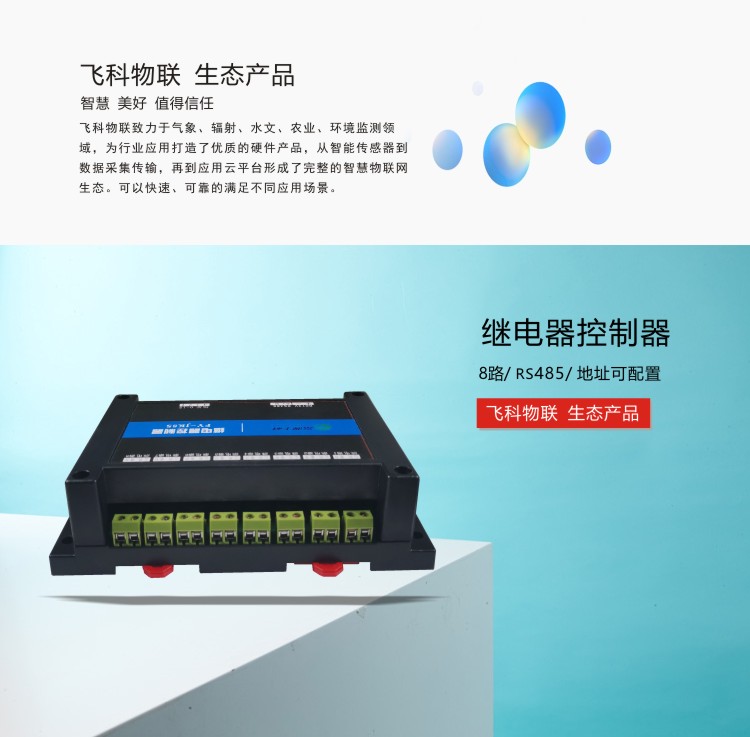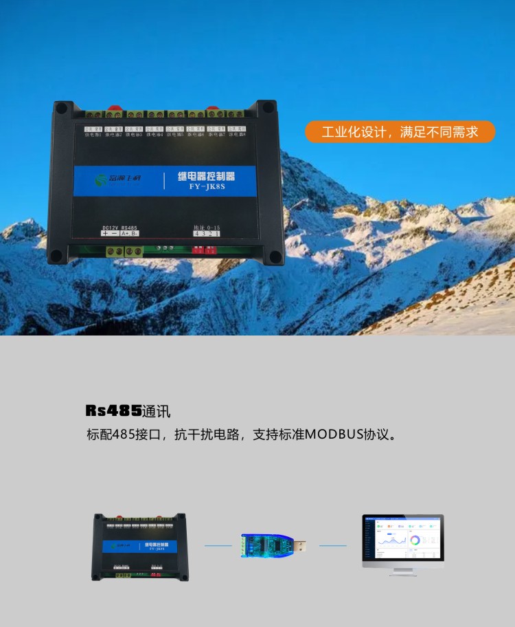 FY-JK8S型繼電器控制器是8路繼電器控制器,帶8路常開觸點輸出,可用于智能家居控制即時控制,也可以通過定時控制,可直接控制小于10A-250VAC的設備,若控制大型設備,再連接一個大的中間繼電器即可。繼電器控制器可連接我司云平臺,可通過電腦登錄云平臺、微信小程序及手機APP控制8路繼電器的閉合。具備RS232、RS485等多種通訊接口實現數據遠傳,開放式通訊協議,方便用戶實現系統集成或二次開發。