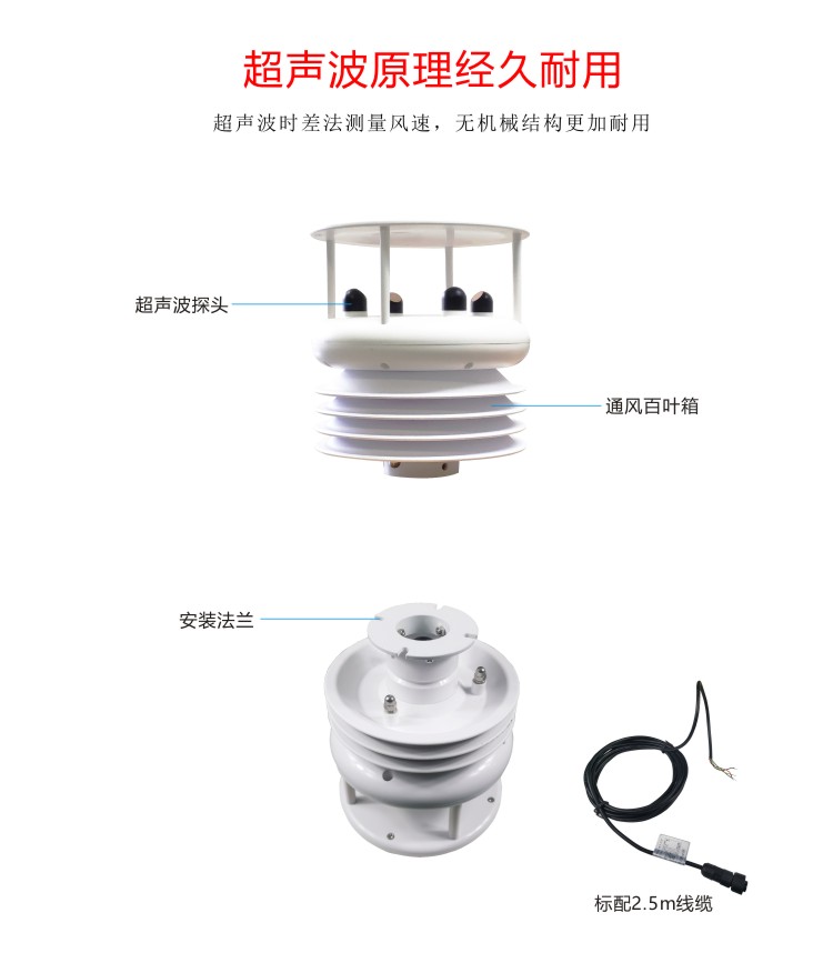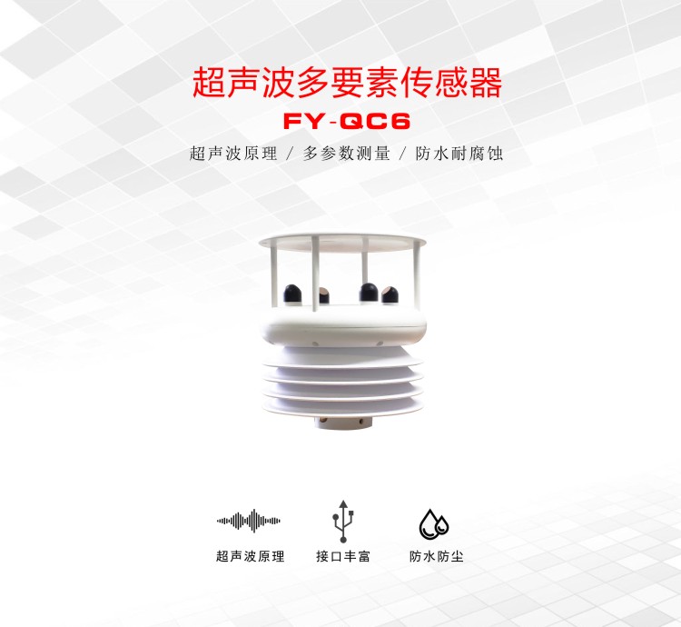FY-QC6超聲波多要素傳感器采用高頻超聲波來(lái)測(cè)量風(fēng)速和風(fēng)向,解決了傳統(tǒng)機(jī)械式測(cè)風(fēng)儀機(jī)械磨損的難題,沒(méi)有移動(dòng)部件,測(cè)量精度更高,性能更加可靠。超聲波探頭可以精確測(cè)量出風(fēng)速和風(fēng)向。并集成了溫度、濕度、氣壓、PM2.5、輻射、光照、噪聲等。傳感器具有4個(gè)超聲波探頭。兩個(gè)探頭一組,進(jìn)行相互收發(fā)。在無(wú)風(fēng)的環(huán)境下,從每一個(gè)探頭發(fā)出的超聲波到達(dá)對(duì)面探頭的時(shí)間都是一樣的;當(dāng)有風(fēng)的情況下,風(fēng)會(huì)影響超聲波到達(dá)對(duì)面探頭的時(shí)間,通過(guò)計(jì)算探頭之間超聲波傳輸時(shí)間差,可以計(jì)算出當(dāng)時(shí)的風(fēng)速和風(fēng)向。傳感器內(nèi)部具有一個(gè)微處理器,可以通過(guò)4個(gè)探頭的測(cè)量數(shù)據(jù)來(lái)計(jì)算出合成風(fēng)速和風(fēng)向。在整個(gè)過(guò)程中,傳感器同時(shí)測(cè)量空氣溫度,來(lái)對(duì)聲速在不同溫度下的變化進(jìn)行補(bǔ)償。雷達(dá)式雨量探頭,可以快速準(zhǔn)確的測(cè)量雨量強(qiáng)度。