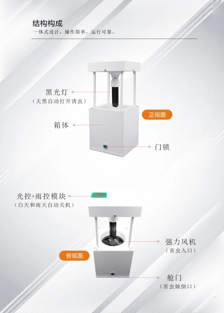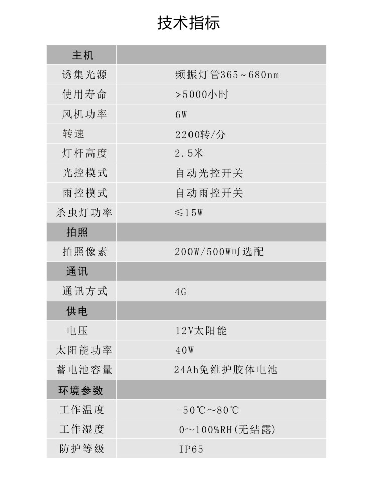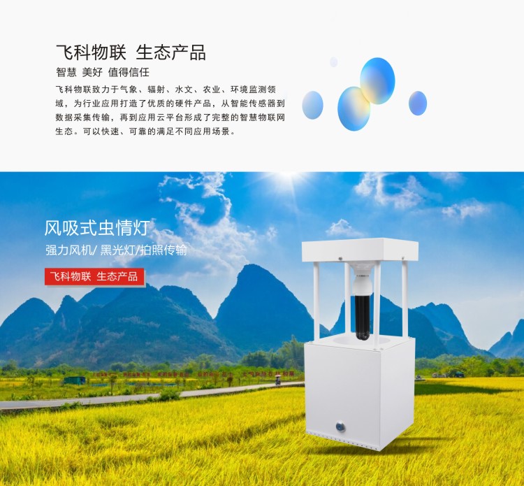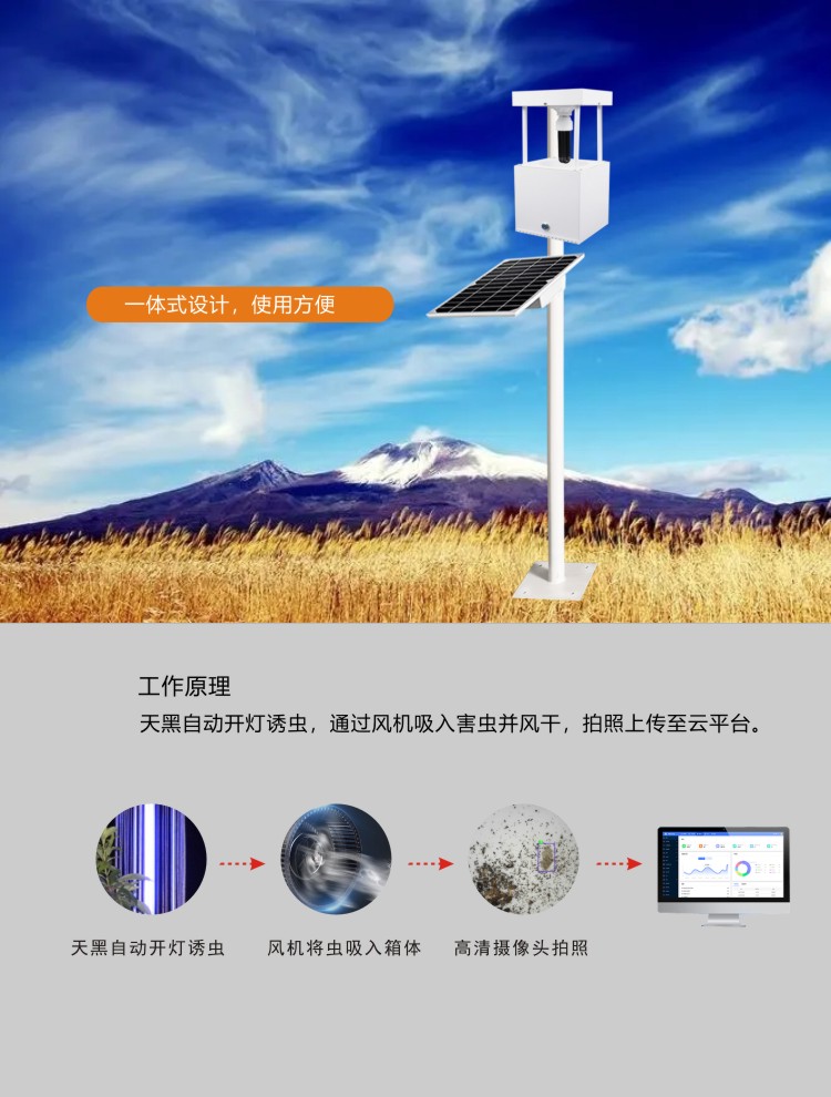 FY-CT200風吸式蟲情燈專為農林業蟲情測報而研制,該蟲情測報燈利用風吸式原理實現自動誘蟲、殺蟲、拍照等功能。采用抽拉式箱體及設備集成結構,利用光波引誘害蟲成蟲撲燈,然后風機轉動產生氣流將蟲子吸入到收集器中,使之風干、脫水,達到殺蟲的目的。本系統通過太陽能電池板將光能轉化為電能使用,節能省電,成本低廉,為以往害蟲防治時因電源供應困難而被迫放棄燈光誘殺害蟲的地區,提供了先進的防治措施。風吸式殺蟲燈廣泛用于農業、林業及園藝、畜牧、城鄉環境衛生等。