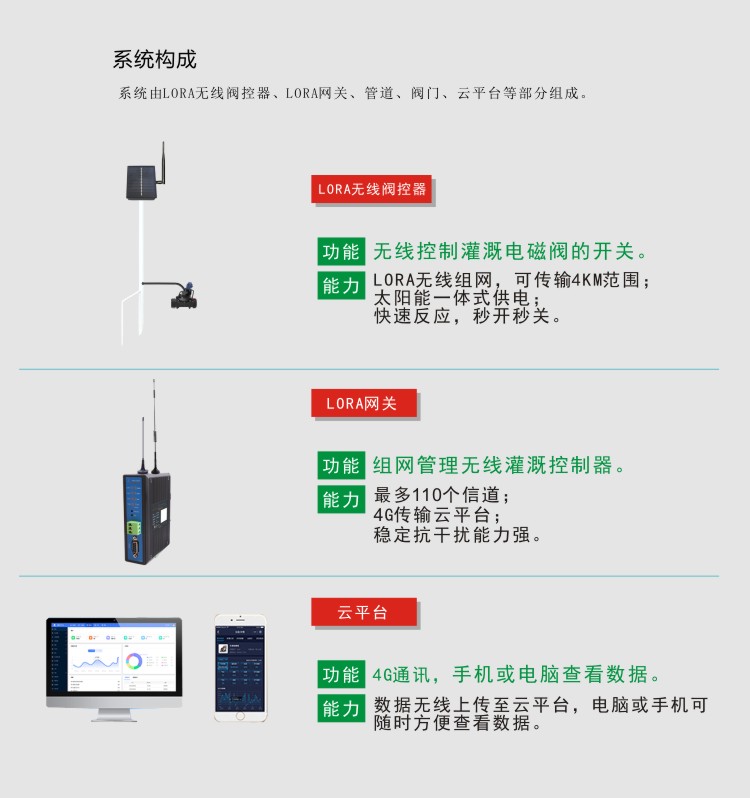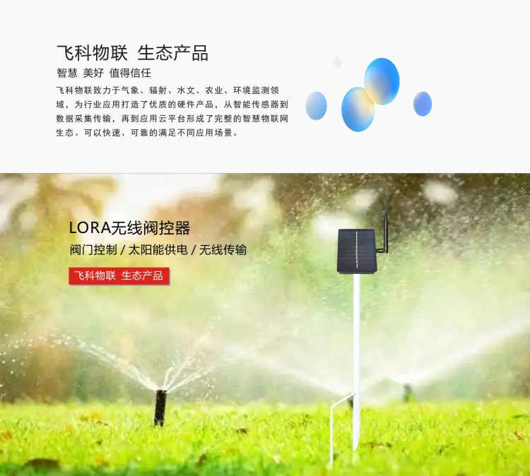 FY-WT200型LORA無線閥控器專門用于自動灌溉控制,采用基于擴頻通信的超遠距離、低功耗LoRa無線傳輸技術,實現對灌溉設備的統一管理和遠程控制。具有節水,高效,節省人工的特點,精準調控,提高了水資源利用率,節水可達16%-30%。