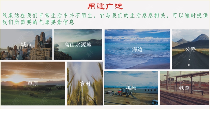 FY-FARM300型自動氣象站可廣泛應用于氣象、環保、機場、農林、水文、工農業生產、旅游、城市環境監測、倉儲、科學研究等領域。