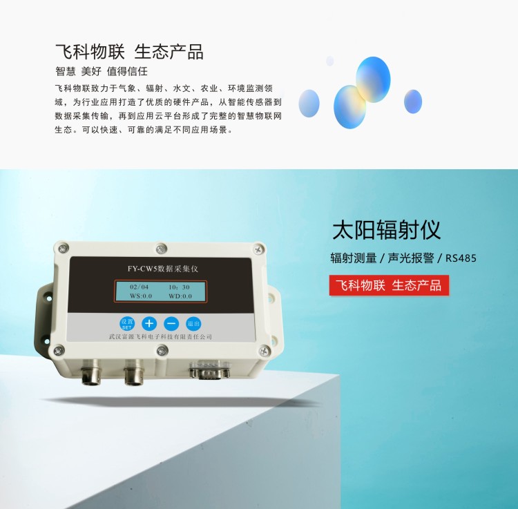 FY-CW5太陽輻射儀由太陽總輻射傳感器及智能數據采集儀構成,用于測量并顯示太陽輻射強度值以及日累計輻射量。內置大容量FLASH存儲芯片可自動存儲至少一年的數據,儀器配備有RS232或RS485接口用于與計算機建立有線通訊連接,還可選配4G無線模塊建立遠程無線連接,通過配套的上位機軟件可遠程觀測實時數據,用戶還可利用該功能完善的氣象軟件對數據作進一步的處理分析。