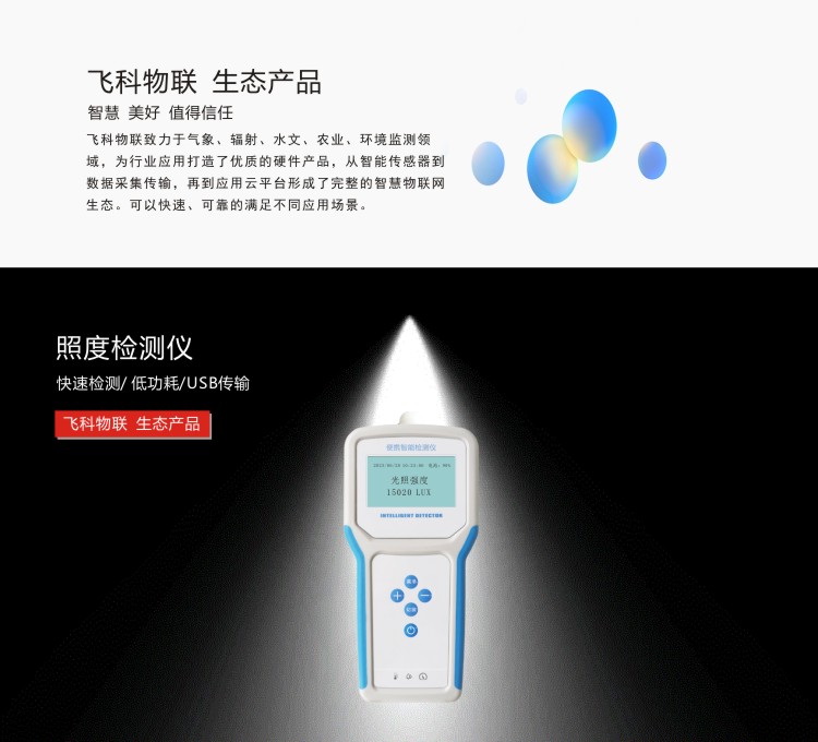 FY-TH600光照度檢測儀是一款攜帶方便,操作簡單的便攜式環境檢測設備。低功耗大屏液晶時顯示光照強度值,測量范圍寬,可滿足所有光照檢測要求。內置大容量FLASH存儲芯片可存儲4萬條歷史數據;通用USB通訊接口,使用配套的USB線纜即可將數據下載到電腦,也可通過4G將數據傳輸至云平臺,方便用戶對氣象數據的進一步處理分析。