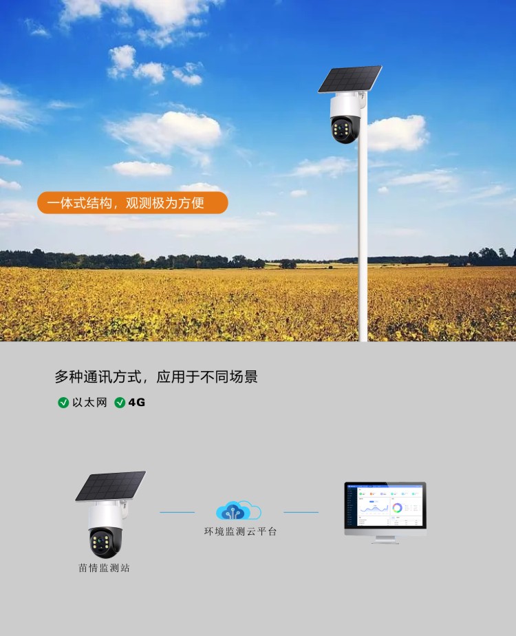 FY-MQ2000苗情監(jiān)測系統(tǒng)用于對(duì)農(nóng)作物的生長發(fā)育狀態(tài)、病蟲害情況以及災(zāi)情進(jìn)行實(shí)時(shí)視頻監(jiān)控。產(chǎn)品采用 4G 無線傳輸,支持太陽能供電。結(jié)合氣象、墑情等傳感器以及蟲情預(yù)報(bào)燈等,可以對(duì)田間苗情、蟲情、災(zāi)情實(shí)現(xiàn)全方位自動(dòng)監(jiān)測,使用戶可以遠(yuǎn)程關(guān)注作物生長狀況,根據(jù)作物在不同生長周期的需求,指導(dǎo)灌溉、施肥、噴藥等措施。