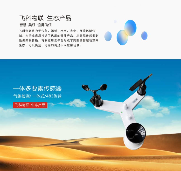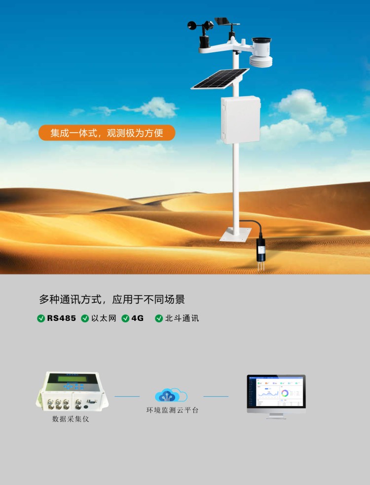 FY-CQ100系列一體多參數氣象站,可對風速、風向、溫度、濕度、氣壓、雨量、光照、輻射、土壤溫濕度、鹽分、電導率、PM2.5等進行同步測量。采用進口傳感元件作為感應部件,具有測量精度高、穩定性好等特點,傳感器采用先進的電路集成模塊,可根據用戶的不同需求輸出RS232、RS485、4G等通訊方式傳輸。儀器體積小巧,安裝方便且便攜,性能可靠;可廣泛應用于氣象觀測、環境控制、農業、工廠等諸多領域。