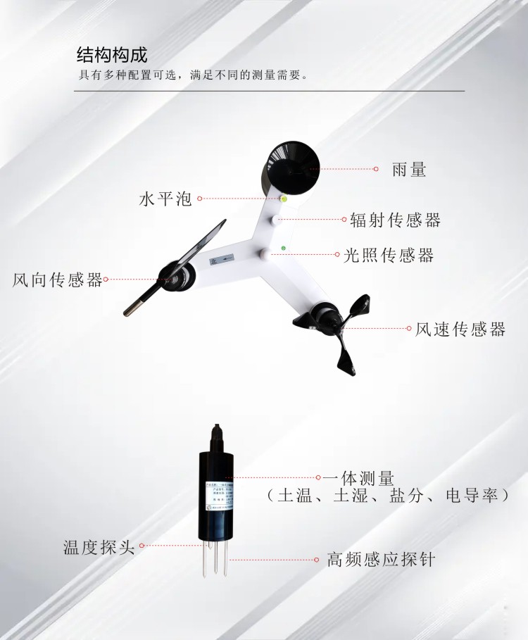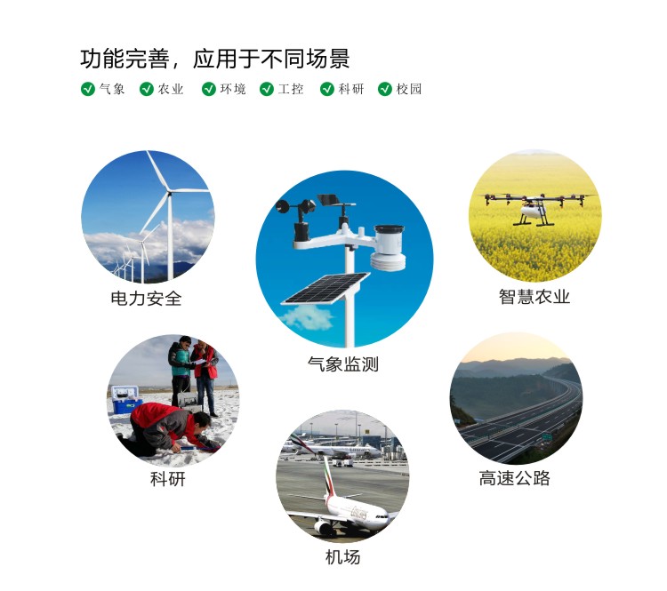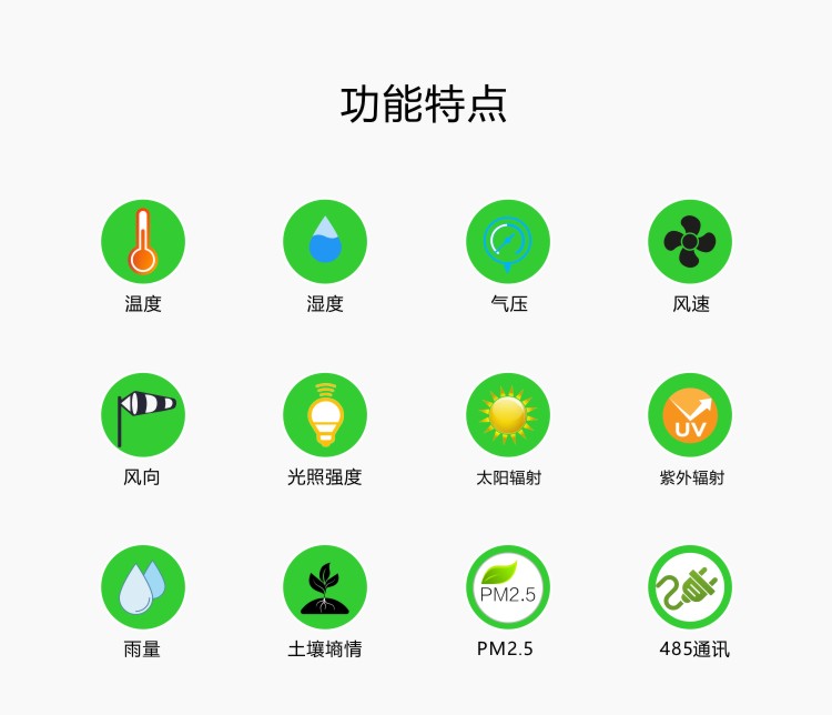 ●測量風速、風向、溫度、濕度、氣壓、雨量、光照、輻射、土壤溫濕度、鹽分、電導率、PM2.5等;