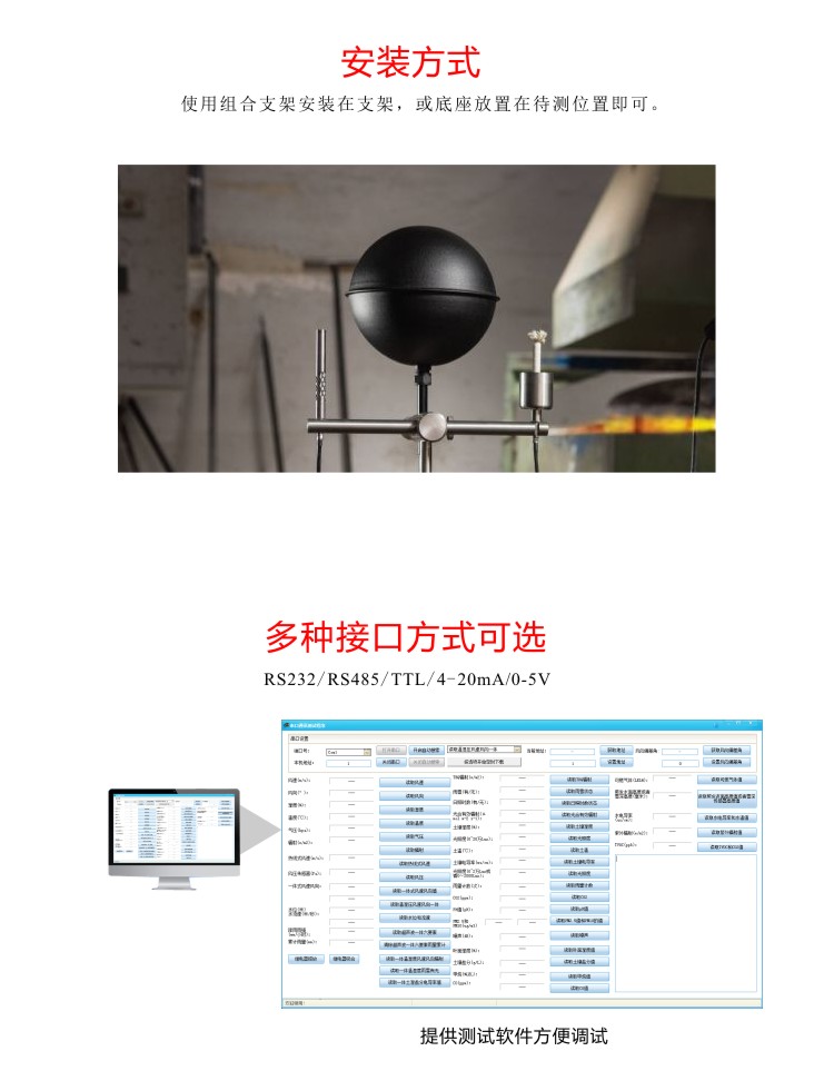 黑球溫度反映了人體對周圍環(huán)境所感受熱輻射的狀況,包含了周圍的氣溫、熱輻射等綜合因素的影響。FY-TB 黑球溫度變送器由表面涂黑的直徑15cm的空心薄壁銅球構(gòu)成,其球心處組建溫度傳感器,測得的溫度即為黑球溫度。通過算出可以得到表示周圍環(huán)境表面對人體熱輻射作用的平均輻射溫度 。黑球為精密模具沖壓成型的黃銅球體,有良好的導(dǎo)熱性和高的比熱,產(chǎn)品設(shè)計符合GB/T 17244-1998熱環(huán)境要求,根據(jù) WBGT指數(shù)對作業(yè)人員熱負(fù)荷的評價及其 GB/T 4200-2008高溫作業(yè)分級標(biāo)準(zhǔn)的研究要求,也符合其他記錄黑球溫度變化情況的關(guān)聯(lián)標(biāo)準(zhǔn) 。