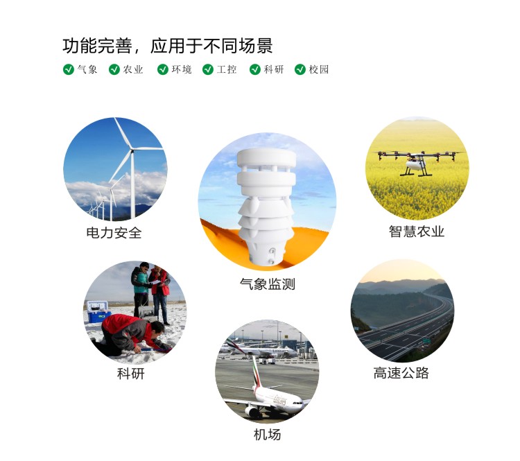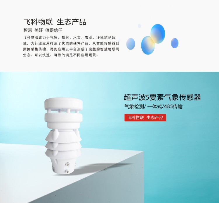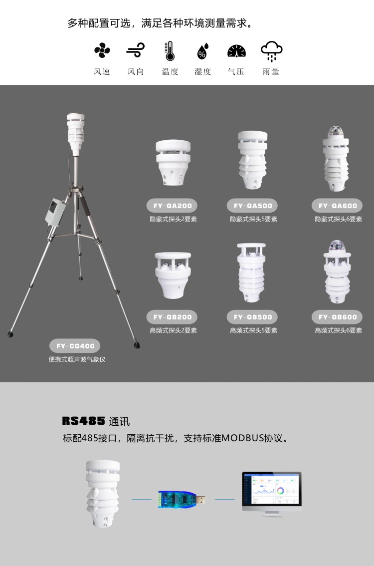 FY-QA500超聲波5要素傳感器采用超聲波原理,一體式結構可對風速、風向、溫度、濕度、氣壓等進行同步測量。采用高精度傳感元件作為感應部件,具有測量精度高、穩定性好等特點,傳感器采用先進的電路集成模塊,可根據用戶的不同需求輸出RS232、RS485、4G等通訊方式傳輸。儀器體積小巧,安裝方便且便攜,性能可靠;可廣泛應用于氣象觀測、環境控制、農業、工廠等諸多領域。