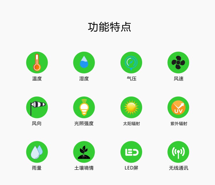 ●測量風速、風向、溫度、濕度、氣壓、雨量、光照、輻射、土壤溫濕度、鹽分、電導率、PM2.5等;