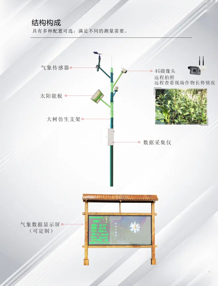 FY-FARM300系列農業氣象站,可對風速、風向、溫度、濕度、氣壓、雨量、光照、輻射、土壤溫濕度、鹽分、電導率、PM2.5等進行同步測量。采用進口傳感元件作為感應部件,具有測量精度高、穩定性好等特點,傳感器采用先進的電路集成模塊,可根據用戶的不同需求輸出RS232、RS485、4G等通訊方式傳輸。儀器體積小巧,安裝方便且便攜,性能可靠;可廣泛應用于氣象觀測、環境控制、農業、工廠等諸多領域。