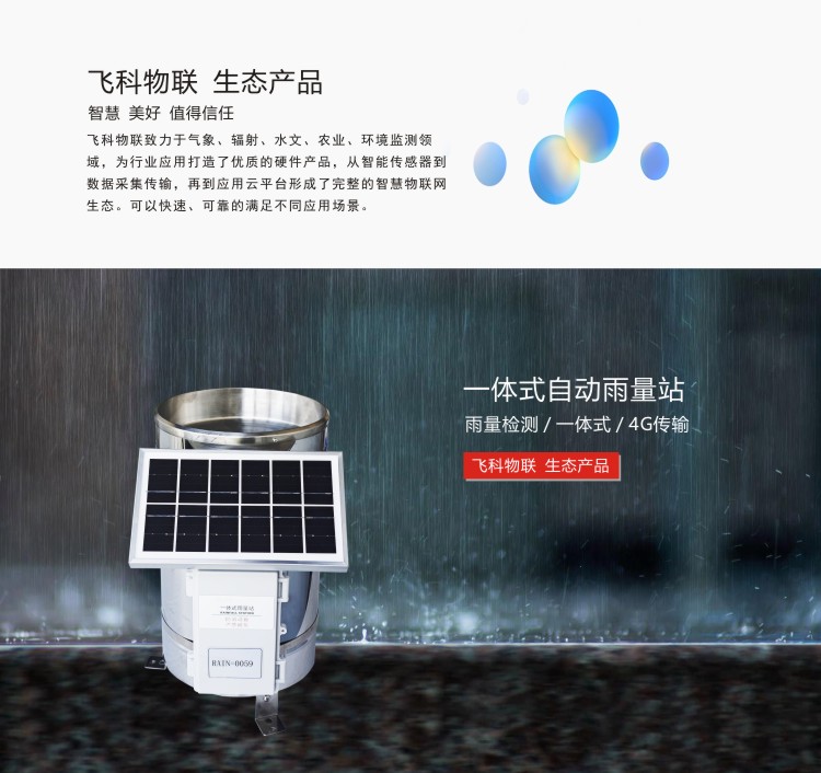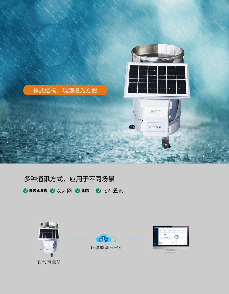 FY-WL700一體式自動雨量站是用于測量雨量水文信息的自動觀測儀器。自動雨量站由數據采集儀、雨量傳感器、無線通訊模塊、太陽能供電系統、云平臺軟件等部分構成。數據采集儀用于采集及記錄雨量信息,并通過4G無線模塊向云平臺上報數據,系統采用一體式設計,安裝方便。