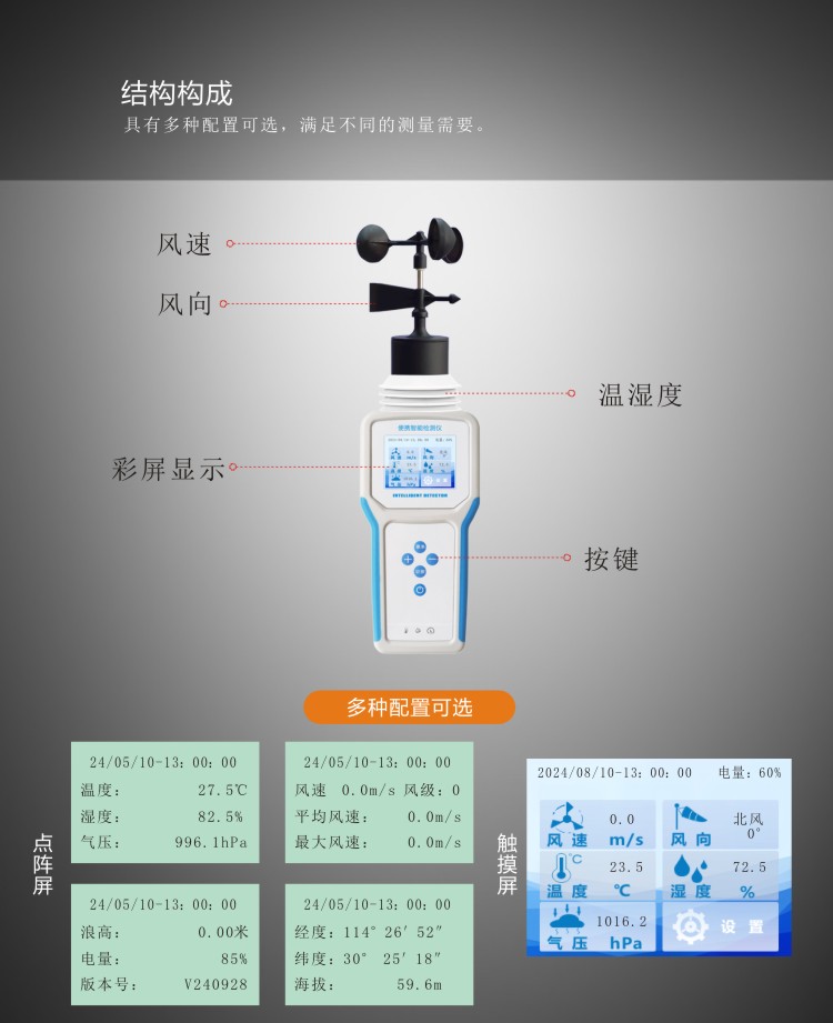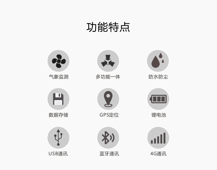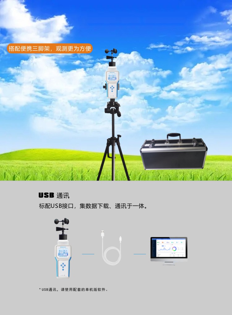 FY-Q2多功能電子氣象儀是一款攜帶方便,操作簡單,集多項氣象要素于一體的可移動式氣象觀測儀器。系統采用精密傳感器及智能芯片,用于測量風速,風向、溫度,濕度,露點,大氣壓力,BF 薄福,風寒指數,海拔高度等數據,并可擴展GPS定位功能。內置大容量FLASH存儲芯片可存儲至少一年的氣象數據;通用USB通訊接口,使用配套的USB線纜即可將數據下載到電腦,方便用戶對氣象數據的進一步處理分析。還支持4G無線通訊方式,數據可傳輸至云平臺。本儀器可用于農林、環保、海洋、科學考察等領域。