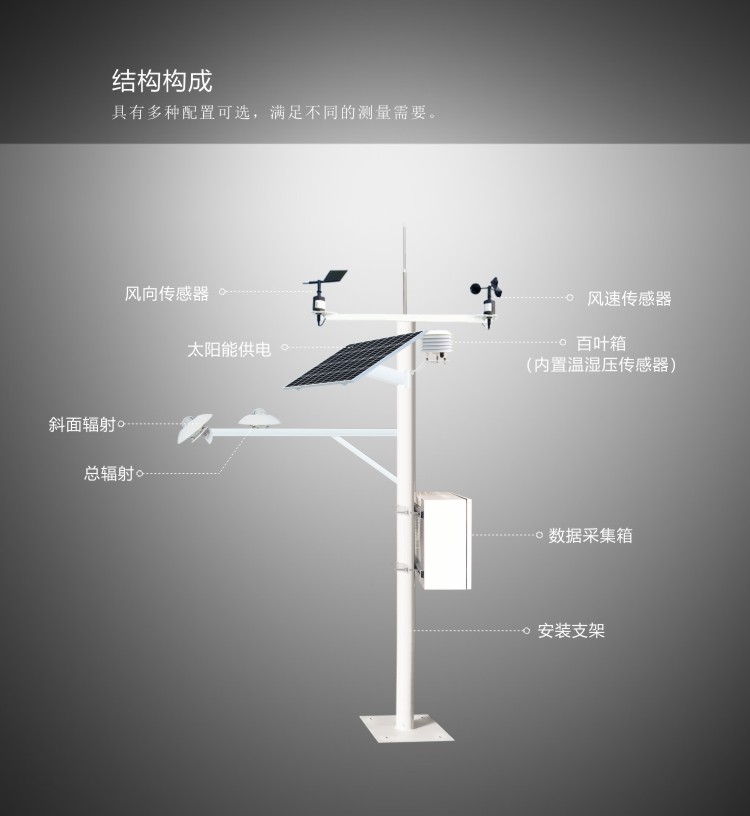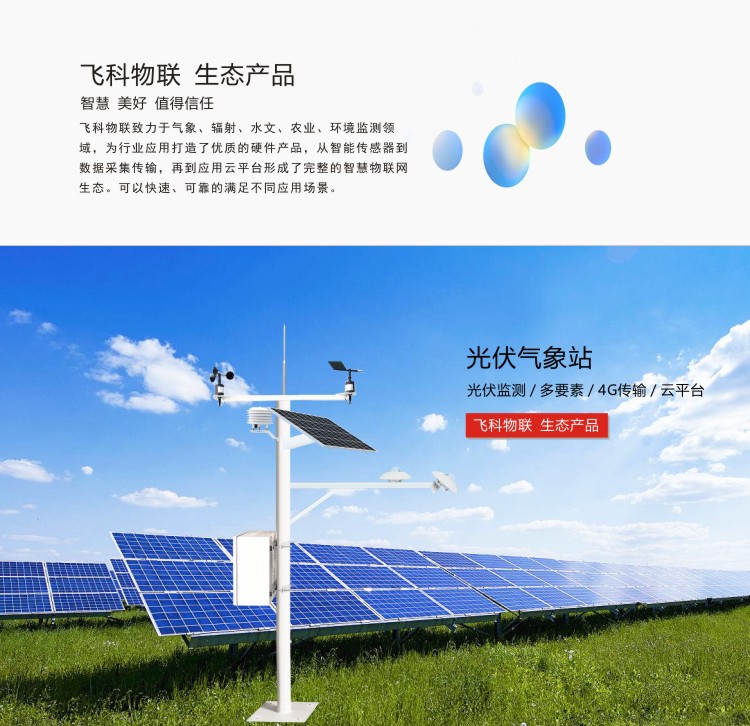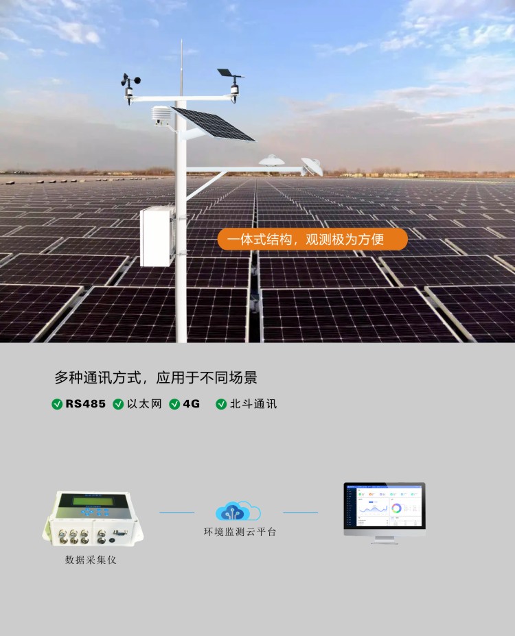 FY-SQ100型光伏電站環境監測系統,是按照氣象WMO組織氣象觀測標準設計,可觀測的環境輻射要素有:環境溫度、濕度、氣壓、組件溫度、風速、風向、傾斜總輻射、日照時數、水平總輻射、太陽直接輻射、太陽散射輻射等指標。具有性能穩定,檢測精度高,完全自動化監測等特點,可滿足光伏電站環境氣象監測、太陽輻射監測等相關要求。