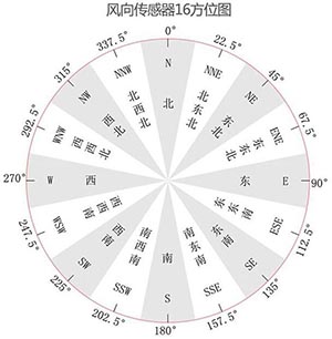 FY-FX風向傳感器默認為0-360°量程范圍,傳感器在出廠前會做定南標定,我們推薦使用180°指南的定義,即傳感器180°為正南指示。常見的十六方位與0-360°之間的關系如下圖所示。