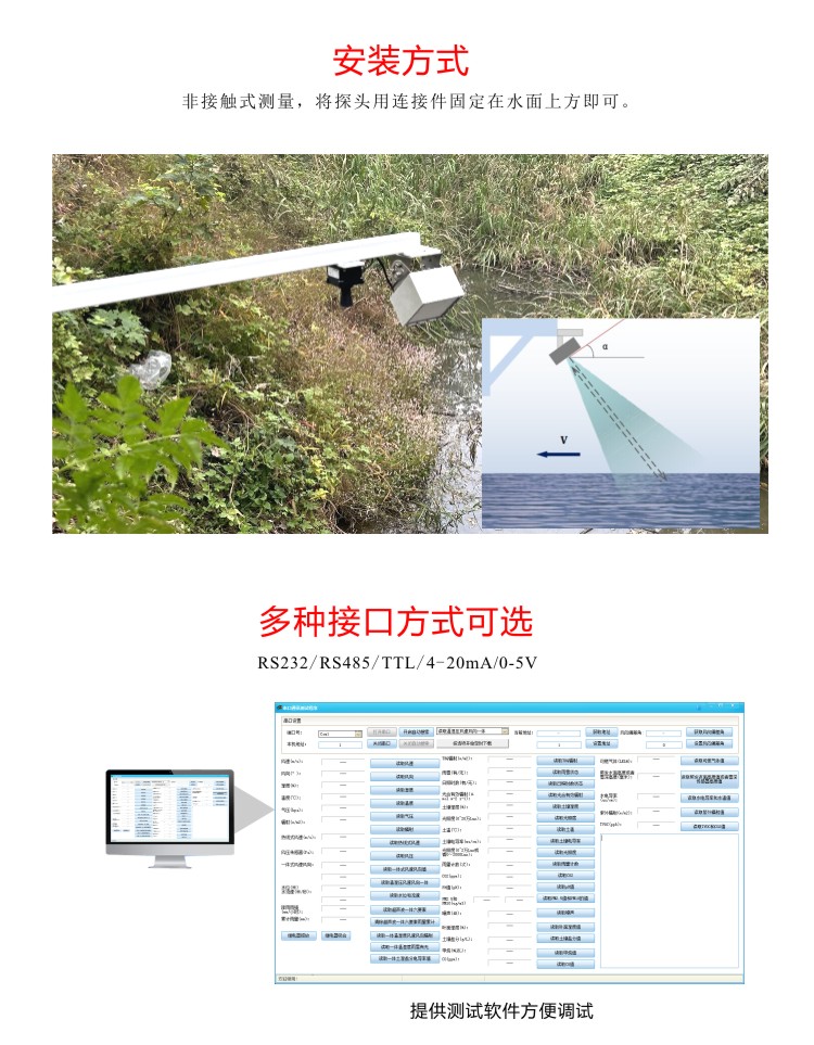 FY-RLS型雷達(dá)流速傳感器是一種采用微波技術(shù)的水流速探測儀器。采用成熟的雷達(dá)流速測量技術(shù),主要應(yīng)用于江河用于江河、湖泊、水庫、水渠等過水?dāng)嗝嬷蓄A(yù)定測點的時段流速的測量。