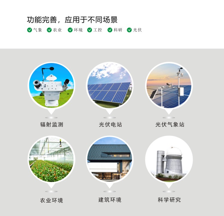 FY-SQ100型光伏電站環境監測系統,是按照氣象WMO組織氣象觀測標準設計,可觀測的環境輻射要素有:環境溫度、濕度、氣壓、組件溫度、風速、風向、傾斜總輻射、日照時數、水平總輻射、太陽直接輻射、太陽散射輻射等指標。具有性能穩定,檢測精度高,完全自動化監測等特點,可滿足光伏電站環境氣象監測、太陽輻射監測等相關要求。